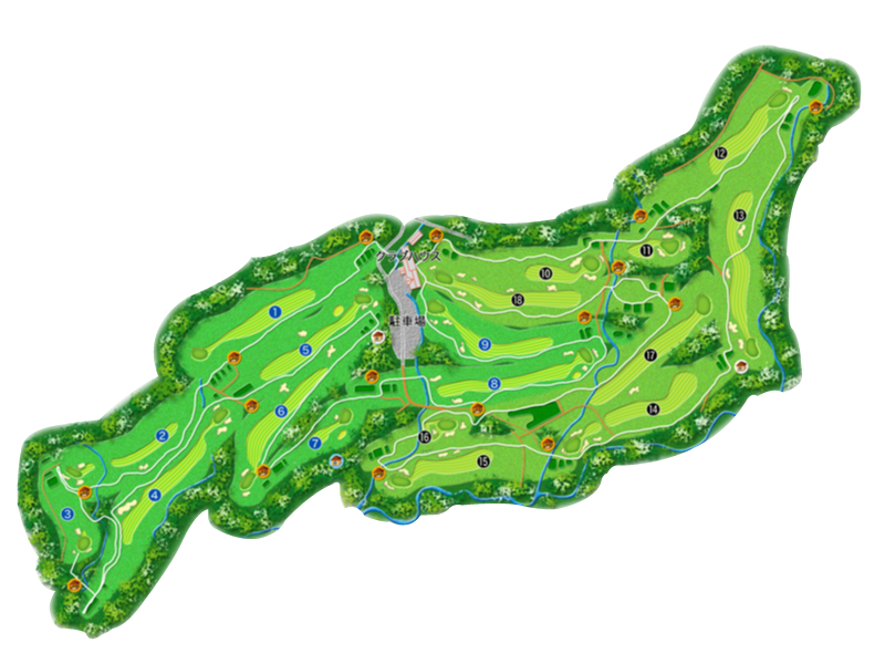 コース全体は、「あるがままを潔し」とするゴルフの基本精神にのっとり、自然のままに手作りで造成しました。そのため丘陵地や傾斜や自然の細やかなアンシュレーションがそのまま残り、それがこのコースでのゴルフを難しくもし、また面白くもしているといえます。バンカーやクリークなども巧みに配置され、ゴルフの醍醐味を存分に味わうことができます。