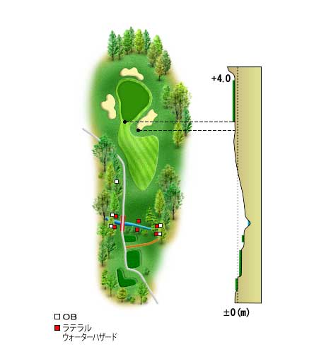 ティーショットは左の林(OB)のプレッシャーがあるが狙い目はグリーン手前のバンカーを避け花道から。届かなくとも寄せワンは充分可能。