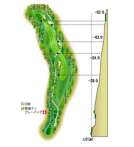 ティーショットは約30メートルの打ち下ろし、ボールの置き所はフェアウェイ右側。