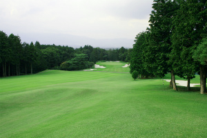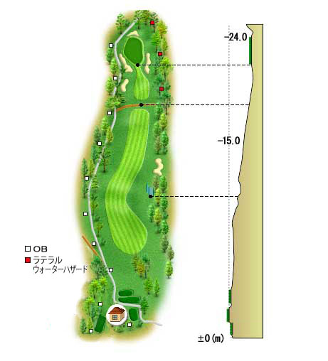 フェアウェイは左傾斜。ティーショットの落としどころはフェアウェイ右側。