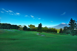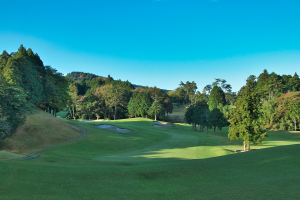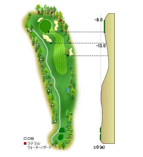 距離の短いパー4。 フェアウェイは上りの右傾斜、右側は杉の木とコブが連続し、バンカーもある。