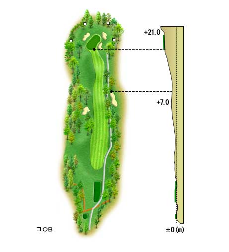 ティーショットのボールの置き所はフェアウェイ中央、但し右傾斜の急な上りなのでフェアウェイ左側にボールを落とす。