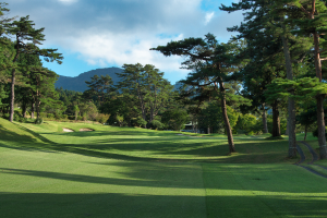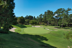 フェアウェイの右バンカー周辺の松の木が難易度を高めている。